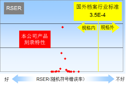 BD-X的一般標準的RSER 要求是1.0E-3以下,本產品采用了JIS Z 6017等國外存檔用光盤標準所規定的更嚴格的標準,達到了RSER 3.5E-4以下。并且在生產過程中管理更加嚴格,在出貨時進行整盤的檢測,并將檢測結果以報告書形式提供給客戶。